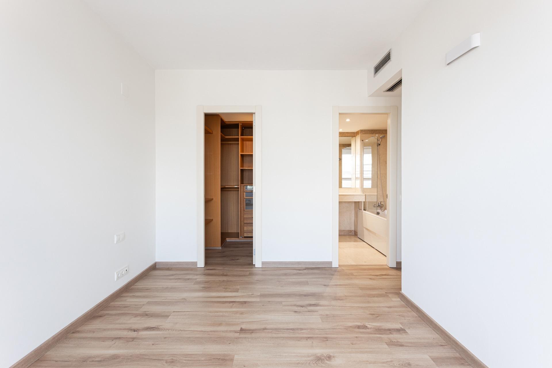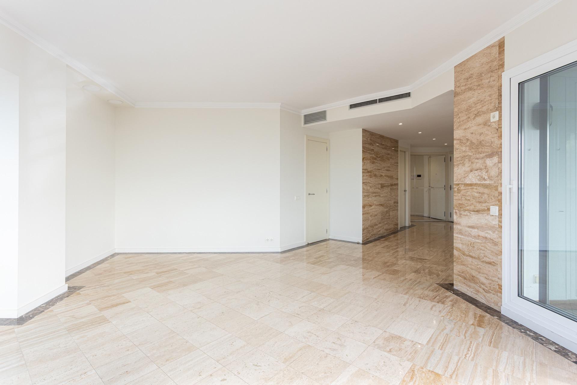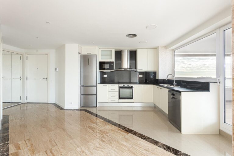 La vivienda se distribuye en un amplio y elegante salón-comedor con cocina americana de diseño, perfectamente integrada, tres dormitorios exteriores —uno de ellos en suite, con vestidor y bañera de hidromasaje— y dos baños completos. Los acabados de alta gama, como los suelos originales de mármol combinados con parqué, aportan un carácter sofisticado y atemporal a la vivienda. Todas las estancias son exteriores, lo que refuerza la sensación de amplitud, confort y conexión constante con el entorno, tanto natural como urbano.